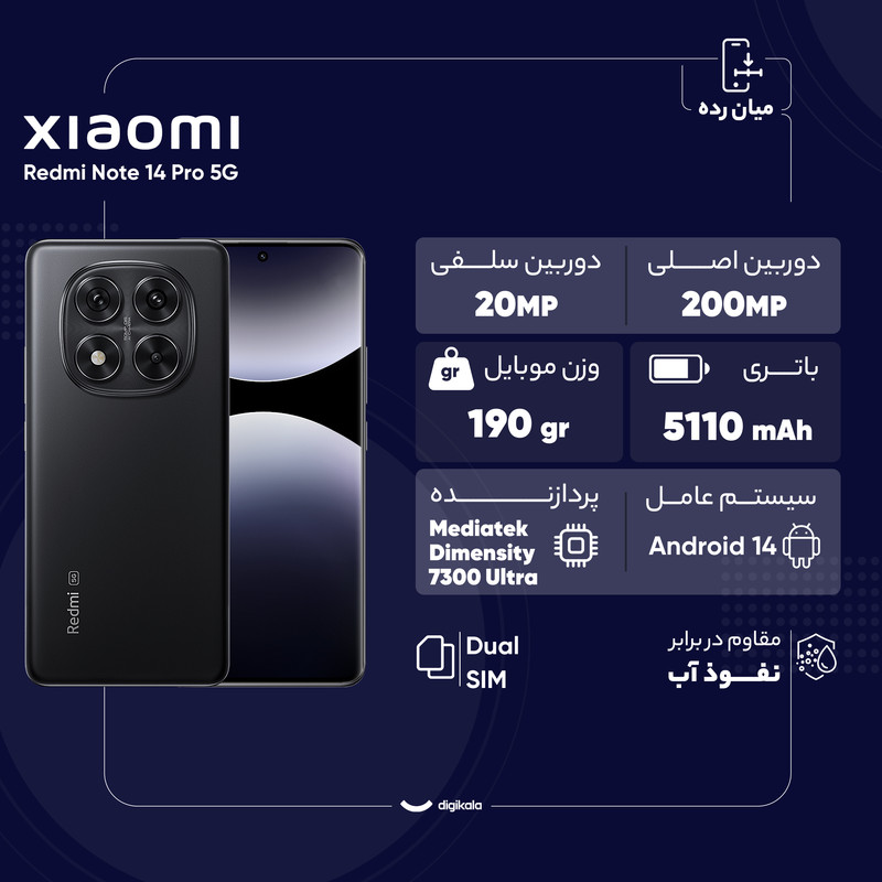گوشی Redmi Note 14 Pro یکی از جدیدترین گوشیهای سری Note شیائومی است که با تمرکز بر طراحی جذاب، عملکرد قدرتمند و نمایشگر بینظیر عرضه شده است. این دستگاه با بدنهای از ترکیب شیشه و پلاستیکی یا چرم مصنوعی و مقاومت در برابر آب و گردوغبار طراحی شده است که ترکیبی از دوام و زیبایی را ارائه میدهد. نمایشگر 6.67 اینچی AMOLED با وضوح 1220 در 2712 پیکسل و نرخ تازهسازی 120 هرتز، تجربه بصری فوقالعادهای را فراهم میکند. پشتیبانی از فناوریهایHDR10+، Dolby Vision و روشنایی 3000 نیت، کیفیت تصویر را به سطحی حرفهای میرساند. محافظت نمایشگر توسط Gorilla Glass Victus 2 نیز مقاومت در برابر خط و خش و ضربه را تضمین میکند. در بخش پردازنده، تراشه Dimensity 7300 Ultra با معماری 4 نانومتری و پردازنده گرافیکی Mali-G615، قدرت کافی برای اجرای بازیها و برنامههای سنگین را فراهم میکند. دوربین اصلی 50 مگاپیکسلی، دوربین فوق عریض 8 مگاپیکسلی و دوربین ماکرو 2 مگاپیکسلی مجموعه دوربینهای این گوشی را تشکیل میدهند. همچنین دوربین اصلی این گوشی امکان ضبط ویدیو 4K با سرعت 24 و 30 فریم بر ثانیه را دارد. دوربین سلفی 20 مگاپیکسلی نیز برای عکاسی پرتره و تماسهای تصویری ایدهآل است. باتری 5500 میلیآمپرساعتی با شارژ سریع 45 واتی، استفاده طولانیمدت و شارژ سریع را تضمین میکند. Redmi Note 14 Pro با امکاناتی همچون اسپیکرهای استریو و رابط کاربری HyperOS بر پایه Android 14، یکی از بهترین گزینهها در میان گوشیهای میانرده محسوب میشود.